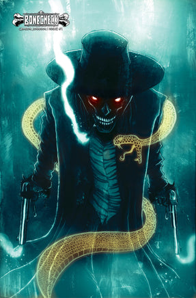 Legends Comics Publishing presents Bonecheck! Thirteen people have gone missing from the Trustworthy Motel. With an ancestral bar tab hanging over his head at the local saloon, a shadow-infested stranger, with an ever so sinister smile, accepts a bounty to investigate and eradicate. Armed with savage instruments of pain, luxurious cigars, and a flask full of damn near poisonous hard liquor, the cryptic bounty hunter will set out to collect his Bonecheck.